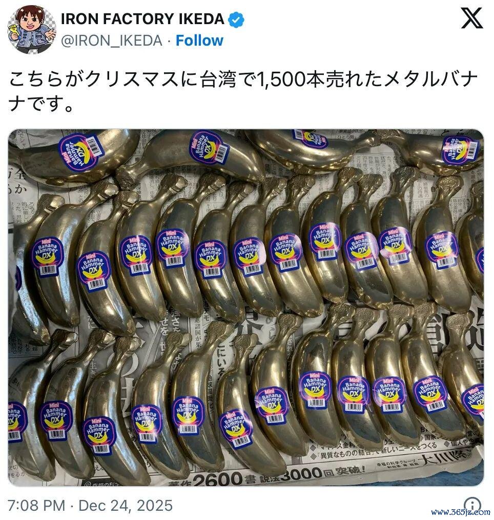 本以为热潮已过,没想到今年圣诞前夕,故事迎来了续集。工厂在12月24日突然发文:“圣诞前夕,我们收到了来自中国台湾地区的约1500根钢铁香蕉订单!正在紧急制作中,谢谢大家!”并配上了工人忙碌抛光和打包的视频,箱子上还特意标注了“发往中国台湾地区”。